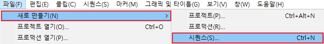 파일 > 새로 만들기 > 시퀀스를 선택해서 시퀀스를 만들 수 있습니다. 또는 Ctrl + N 단축키를 클릭하면 시퀀스를 생성할 수 있습니다.