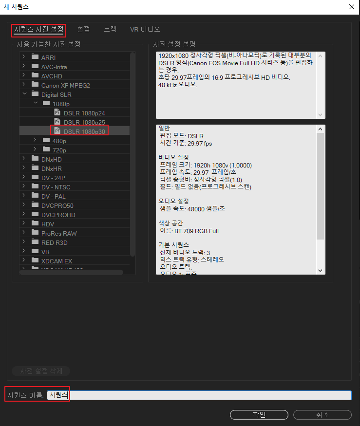 시퀀스 사전 설정에서 DSLR 1080p 30을 선택하고 시퀀스 이름을 입력하세요.