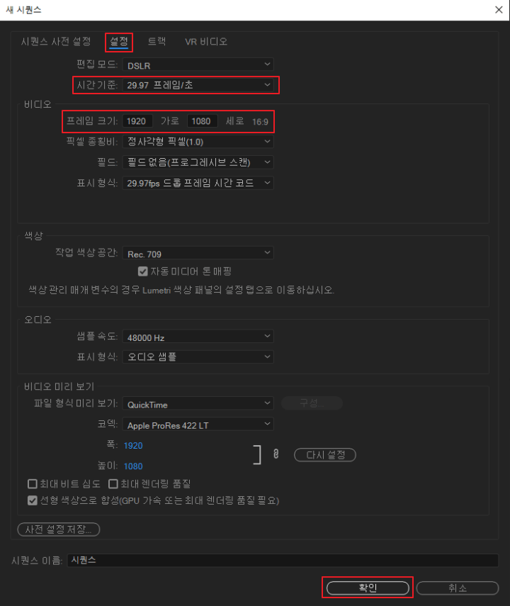 설정에서 시간기준을 29.97 프레임/초를 선택하고 프레임 크기 가로 1920 세로 1080 세로 16:9로 설정하고 확인을 클릭하세요.