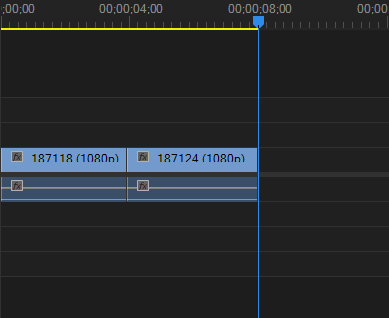 타임라인의 재생헤드 위치를 기준으로 영상의 삽입 및 덮어쓰기가 됩니다. 재생헤드가 04:00에 위치한 상태로 영상 삽입을 하면 기존영상이 뒤로 밀리면서 삽입이 됩니다. 재생헤드가 04:00에 위치한 상태로 덮어쓰기를 했다면 187124 영상이 새로운 영상으로 덮어쓰기 되어서 기존영상은 사라집니다.