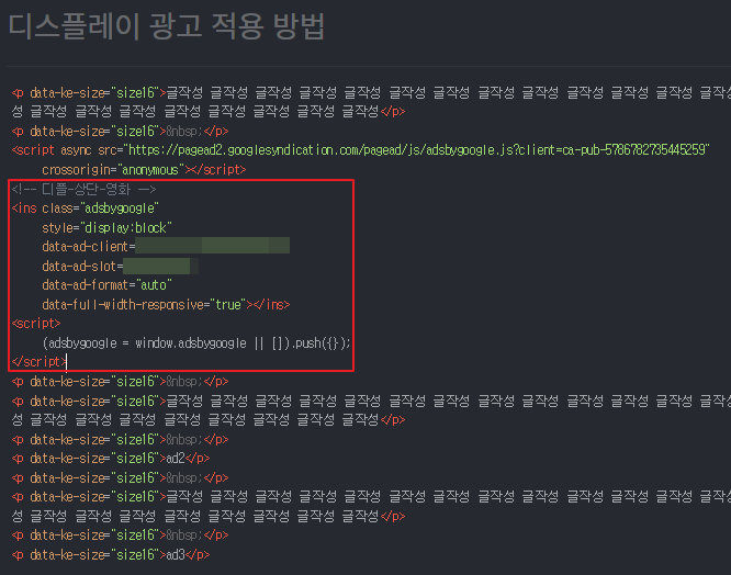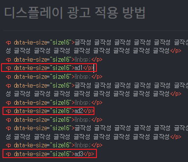 광고코드가 표시한 위치에 들어간 것을 확인할 수 있습니다. ad2, ad3도 중단, 하단을 같은 방식으로 생성하여 광고코드를 복사 붙여 넣기하고 완료를 누르세요.