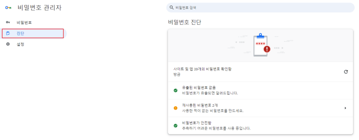 비밀번호 진단에 들어가면 저장되어 있는 목록의 진단결과를 확인할 수 있습니다.