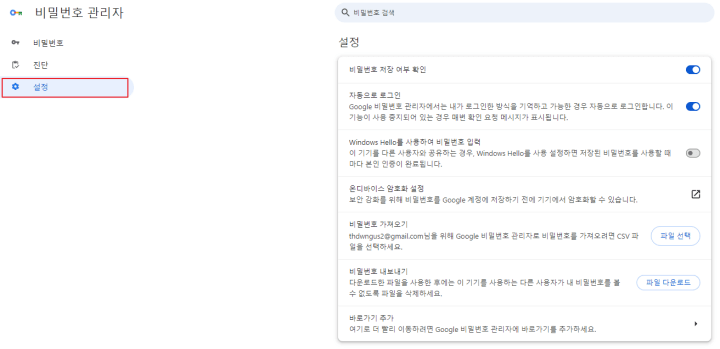 비밀번호 설정은 다양한 설정을 할 수 있습니다. 자동으로 로그인을 설정하면 로그인할 때 아이디, 비밀번호를 불러와서 입력하지 않고 로그인 버튼을 클릭하면 됩니다. 비밀번호 내보내기는 저장된 비밀번호를 csv 파일로 다운로드합니다. 바로가기 추가를 하면 작업표시줄에 아이콘이 생성되어 편하게 사용할 수 있습니다.