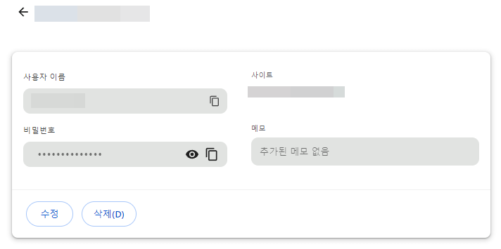 사이트, 사용자 이름, 비밀번호, 메모를 입력하고 저장하세요.