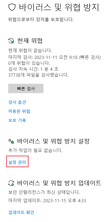 바이러스 및 위협 방지 설정에 있는 설정 관리를 클릭하세요.