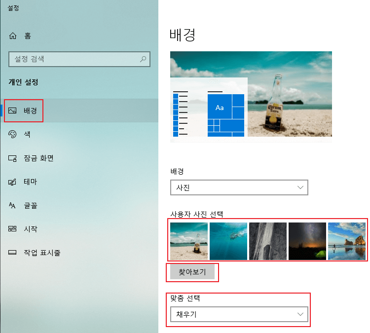 배경에서 사용자 사진 선택에 원하는 이미지가 있다면 선택하면 바로 적용됩니다. 다운로드한 이미지를 적용하려면 찾아보기를 클릭하고 해당 이미지를 클릭하면 적용됩니다. 맞춤 선택은 이미지를 배경화면에 어떠한 방식으로 채울 것인지 설정할 수 있습니다.