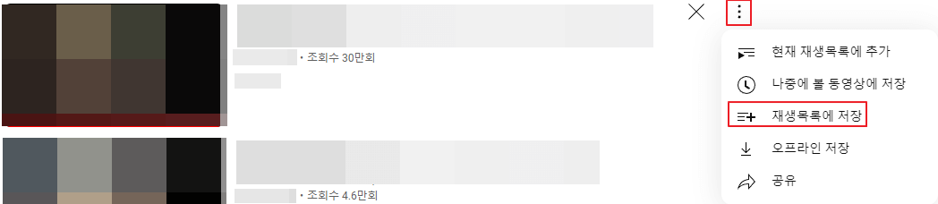 재생목록에 추가할 영상 오른쪽에 있는 더 보기 버튼을 클릭하여 재생목록에 저장을 선택하세요.